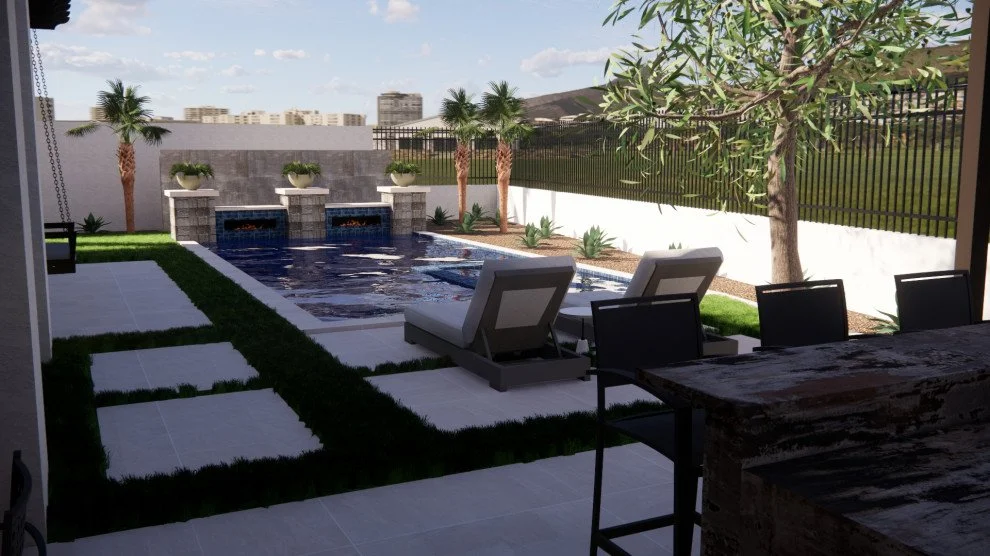 When we began working on this expansive interior and exterior Gainey Ranch renovation, our client shared a layout a pool company had previously proposed for their new rear exterior. And while they liked a few of the elements, they rejected the design for a variety of reasons, some of which were: